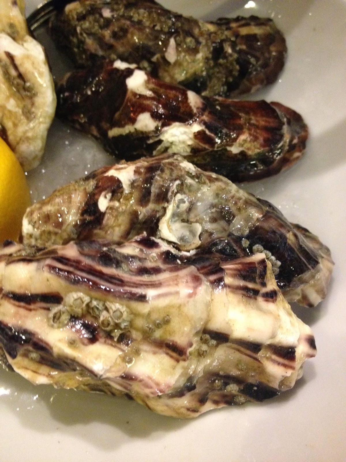 Look at the beautiful color - and size - of these things! She said they tasted different than the Atlantic oysters in Massachusetts. But were excellent. (I'll take her word for it. I don't eat oysters. They're ALIVE, people!)